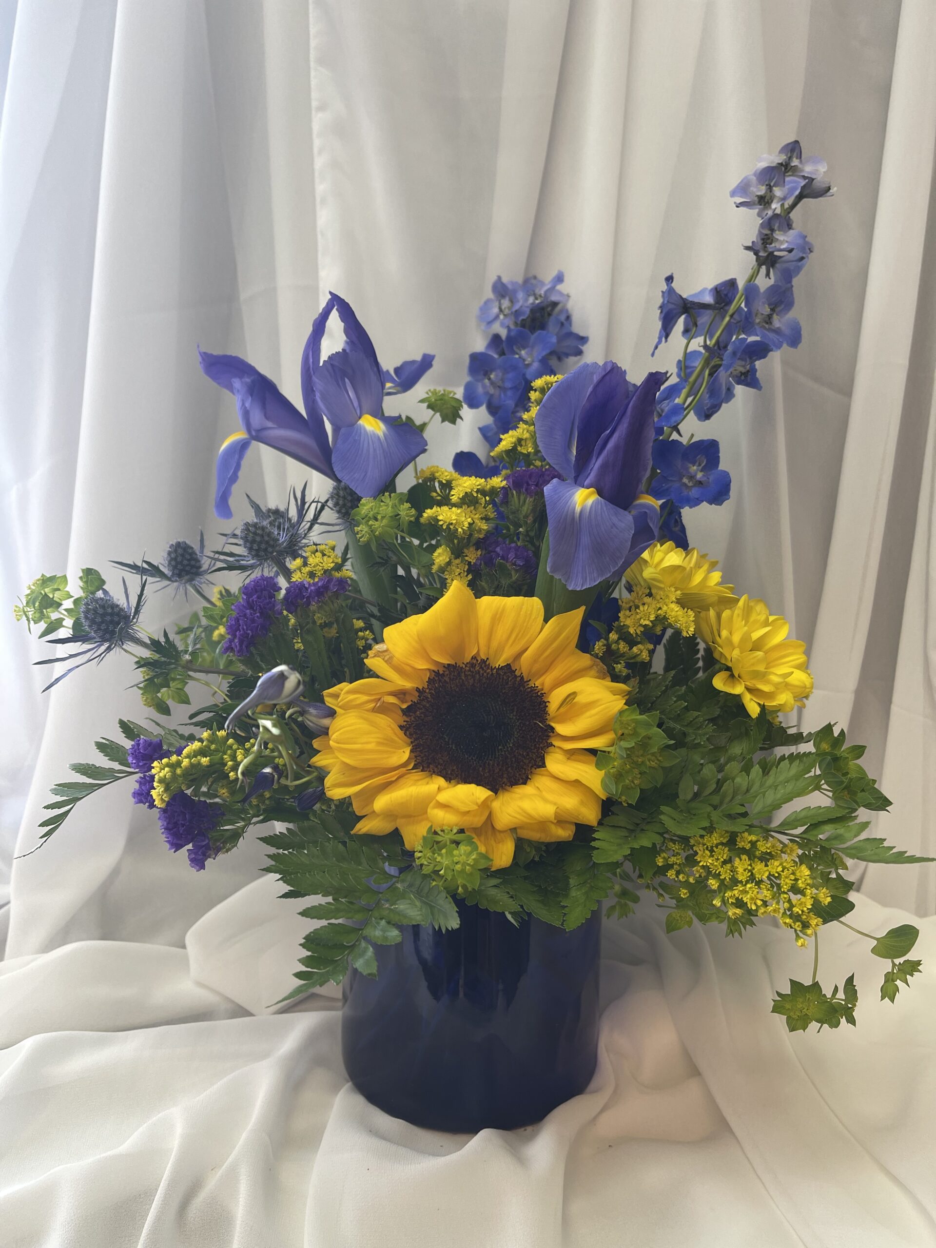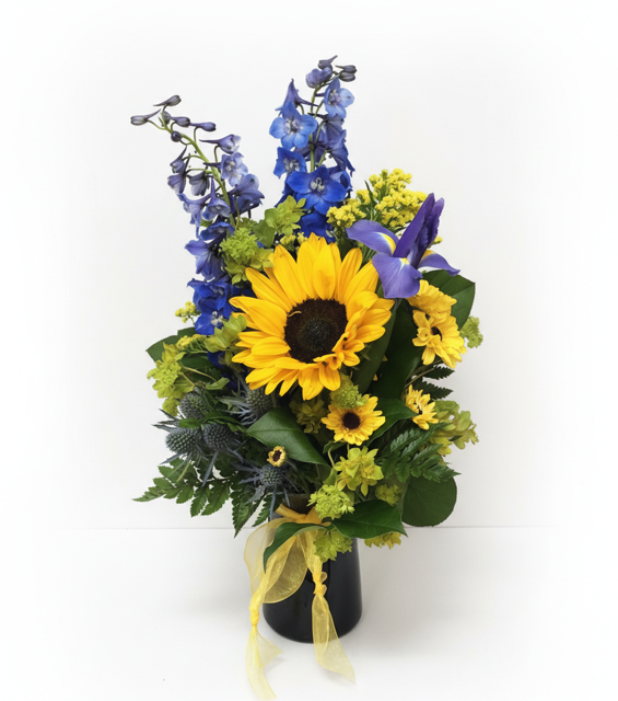 Striking blue irises and radiant sunflowers reflect the colors of the Alaska flag while capturing the brilliance of our summer season—golden sunshine, endless blue skies, and the vibrant beauty that defines our state. Thoughtfully designed in a rich cobalt blue glass cylinder vase, this arrangement is both a luminous floral statement and a timeless keepsake to be cherished long after the blooms have passed.