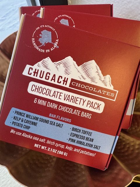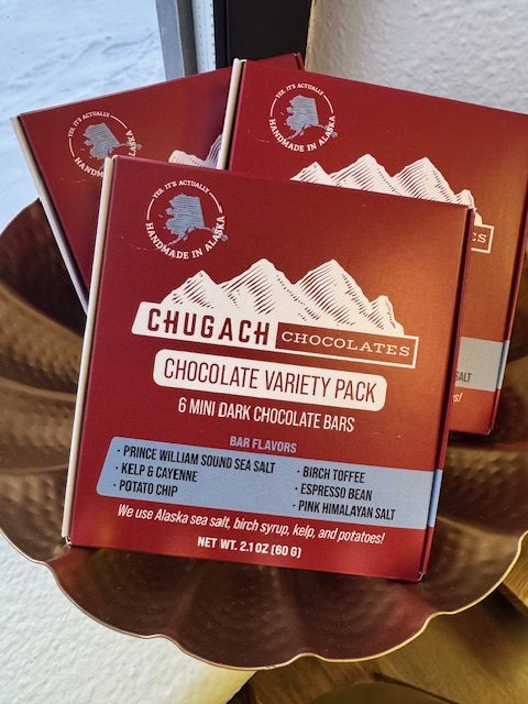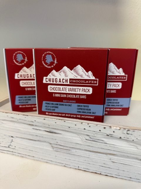 Chugach Chocolates mini-bar variety box combines 6 of their signature flavor bars into one package. It includes a mini-bar of each; Dark Chocolate with Prince William Sound Sea Salt, Birch Toffee, Kelp & Cayenne, Potato Chip, Espresso Bean, and Pink Himalayan Salt. Great for exploring Alaska flavors, or as a gift, or as an introduction to our products.