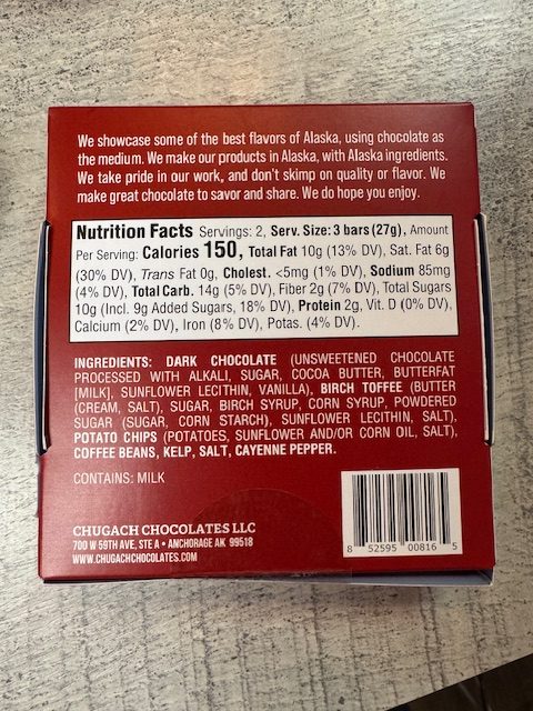 Ingredients: Dark Chocolate (unsweetened chocolate processed with alkali, sugar, cocoa butter, butterfat [milk], sunflower lecithin, vanilla), Birch Toffee (butter (cream, salt), sugar, birch syrup, corn syrup, powdered sugar (sugar, corn starch), sunflower lecithin, salt), Potato Chips (potatoes, sunflower and/or corn oil), Coffee Beans, Kelp, Salt, Cayenne Pepper.